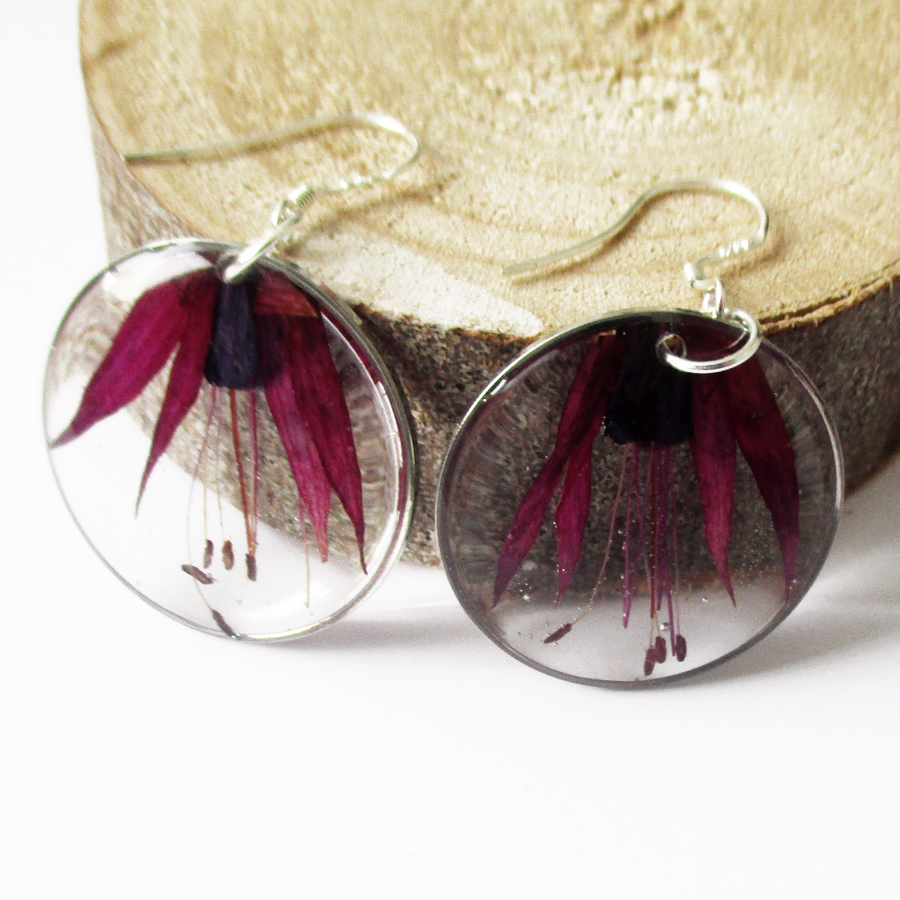 Fusion de fleur et de résine, soyez unique avec nos boucles d’oreilles Fleur de Fuchsia !