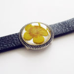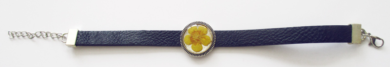 Élégant bracelet floral en simili-cuir bleu marine. Surmonté d’un médaillon en métal argent, il est orné d’une fleur de bouton d’or délicatement préservée dans sa résine transparente.
