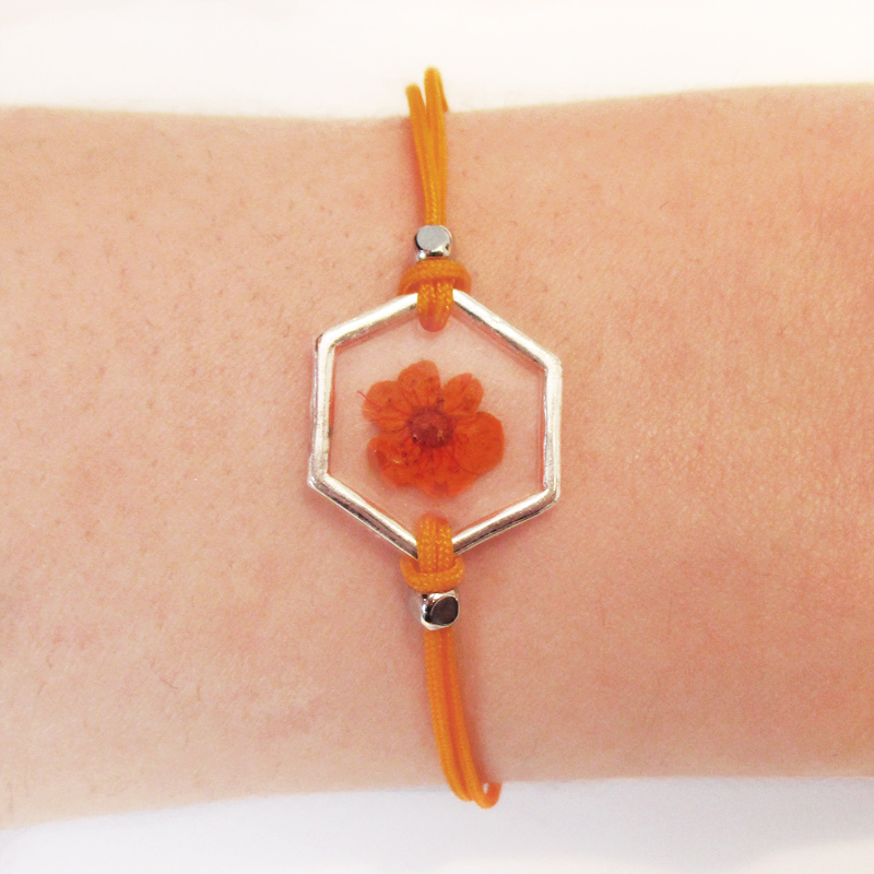 Joli bracelet nature en nylon orange, orné d’un hexagone argenté contenant une délicate fleur orange préservée dans sa résine transparente.