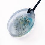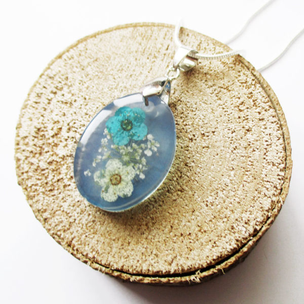 Joli pendentif en résine bleutée contenant de petites fleurs et feuilles séchées aux couleurs printanières.