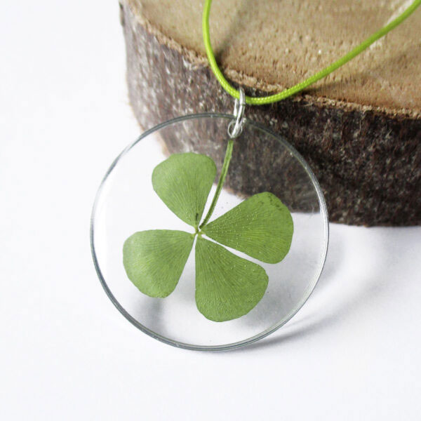 Le pendentif Trèfle à quatre feuilles cerclé de métal argenté en résine transparente contient une joli trèfle à quatre feuilles vert, symbole du porte-bonheur.