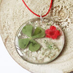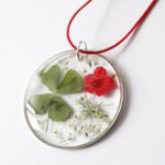 Cerclé d’argent, le pendentif Trèfle Chance en résine transparente contient un mélange de jolies petites fleurs ivoire et rouge autour d’un trèfle à quatre feuilles, symbole du porte-bonheur.