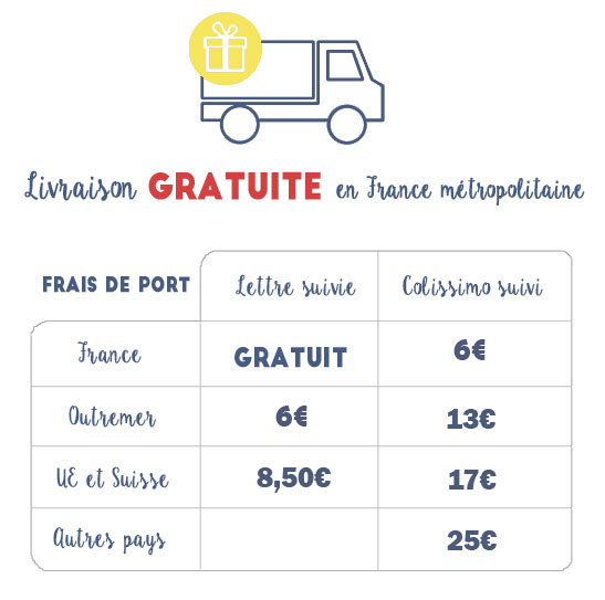 Votre commande est expédiée en Colissimo (assurance intégrée) de la Poste, ou lettre Suivie (sans assurance), et livrée dans votre boite aux lettres.